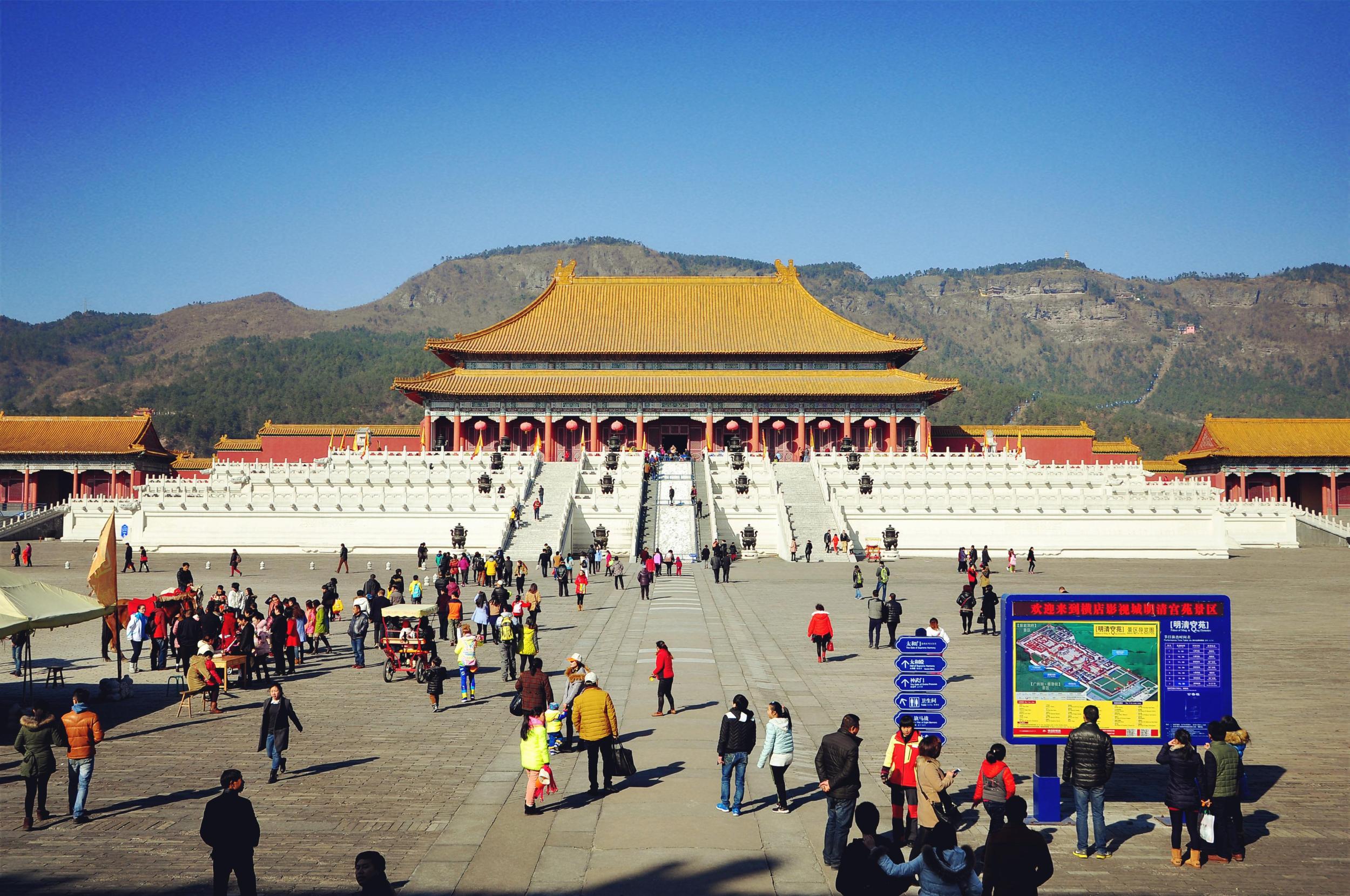 明清宫苑景区是由横店集团投资5亿多元人民币,以北京故宫为原型,按1:1比例兴建的一座特大型景区。占地1500亩,荟萃了京城宫殿、皇家园林、王府衙门、胡同民宅等四大建筑系列,真实地再现了北京紫禁城原貌及老北京民居。