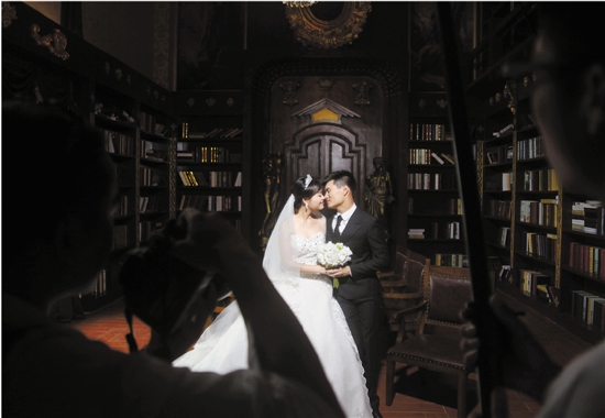 在巧克力小镇拍摄婚纱照的情侣。