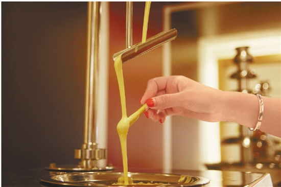 一名游客自己动手制作巧克力。