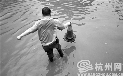 昨天中午11点多,三新路依然被淹。城管四季青中队的老沈,守住路口。积水处有一个井盖打开了,老沈把警示物放在边上,一会儿开过一辆车,警示物被水冲走,老沈又上去放好。记者夏阳摄