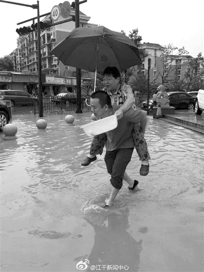 这时我无意间刷到一条微博:上午的一场倾盆大雨,打得大家是措手不及。在三新路(现在叫钱潮路)与昙花庵路交叉口有一片低洼地,很多老年人在此犯了难。水湘社区居委会主任周建强穿着一双布鞋,将这些老年人一个一个背到路对面,用布鞋搭起了一座最美的“桥梁”。