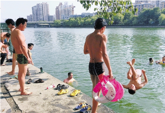 这两天持续高温,杭州市区的贴沙河仿佛成了一个免费露天大泳池,昨天下午,来游泳的多为放假的学生及外来务工者。据了解,贴沙河是杭州饮用水的备用水源,最深处有四五米,是禁止游泳的,往年这里曾多次发生溺水悲剧。