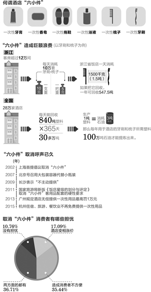 杭州多家星级酒店对于这个条例均表示支持,但也有担心是否能落实到位。据了解,“六小件”耗费大、浪费大,这样的状况在酒店业内已经习以为常。杭州很多高星级酒店每年在这方面的成本开支高达百万元左右。《条例》的实施,从企业角度讲可以给酒店节约成本,降低能耗。另外有人估算过,“六小件”的浪费率高达70%以上。并且,“六小件”多为塑料制品,填埋后很难降解,对环境造成污染。