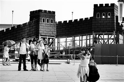昨(12号)天凌晨,立体花坛“长城”的主体造型正式亮相天安门广场。昨天上午,北京青年报记者在天安门广场纪念碑北侧看到,施工人员正乘坐吊车把花卉植物点缀在“长城烽火台”上,目测长城造型有10多米高。不少游客站在围挡外面与“长城”合影留念。