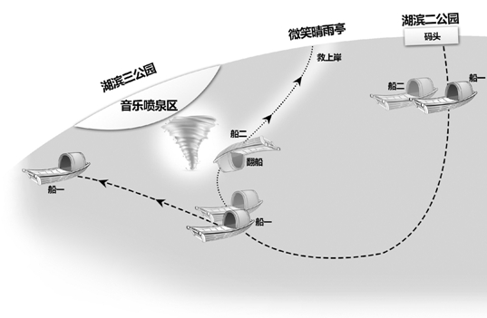 张其根回忆,当时水柱袭来时,风力瞬间变得很大,“人一进入那个漩涡,就感到风大、雨疾、浪高,可等他拼命划离漩涡后,发现外围的西湖湖面上基本无风。”