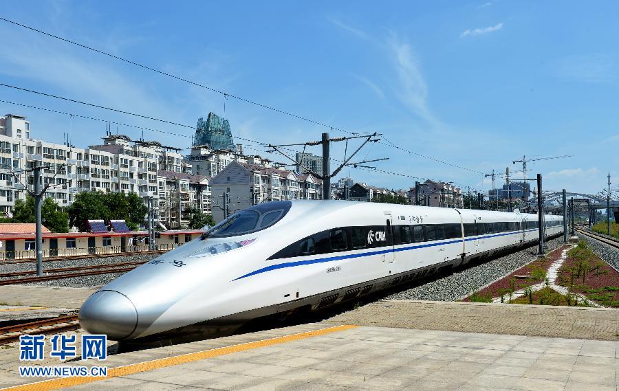 8月27日,一列开往于家堡站“按运行图行车”的试跑动车组列车驶出天津站。目前,京津城际铁路延伸至于家堡工程已完成运行图参数测试、应急演练和故障模拟等试验内容,进入“按运行图行车”试验阶段。试验动车组列车按正常开行动车组标准落实作业流程和作业标准,司乘人员、站车服务人员按正式开通标准做好各项准备工作。京津城际铁路延伸至于家堡工程设计时速350公里。线路自天津站城际车场引出,沿途经军粮城北站、塘沽站至于家堡站。新华社发(杨宝森摄)