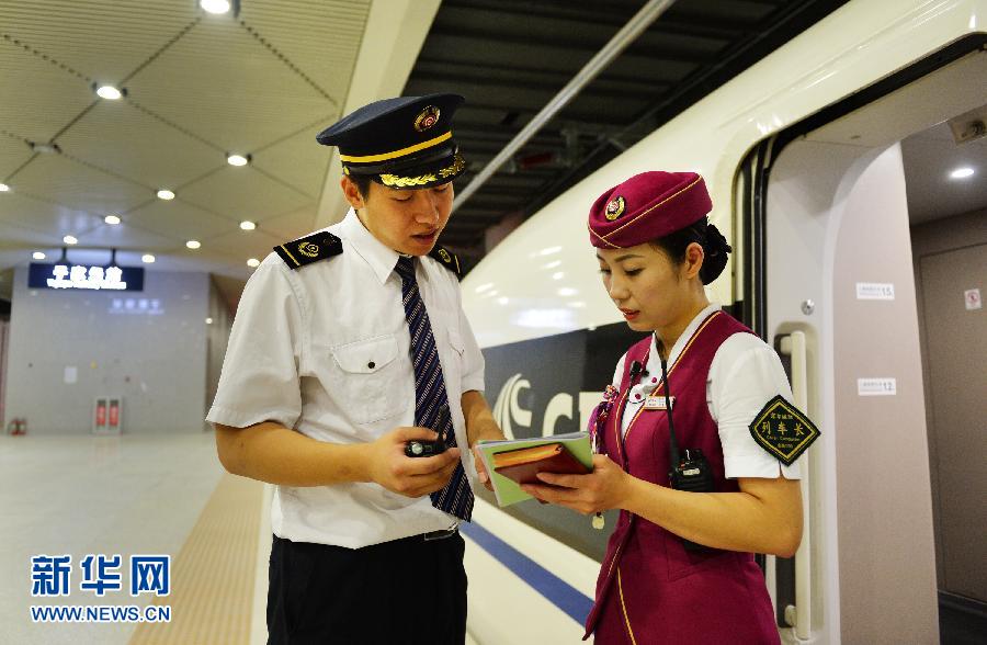 8月27日,试跑动车组列车乘务人员与于家堡站服务人员进行工作对接。目前,京津城际铁路延伸至于家堡工程已完成运行图参数测试、应急演练和故障模拟等试验内容,进入“按运行图行车”试验阶段。试验动车组列车按正常开行动车组标准落实作业流程和作业标准,司乘人员、站车服务人员按正式开通标准做好各项准备工作。京津城际铁路延伸至于家堡工程设计时速350公里。线路自天津站城际车场引出,沿途经军粮城北站、塘沽站至于家堡站。新华社发(杨宝森摄)
