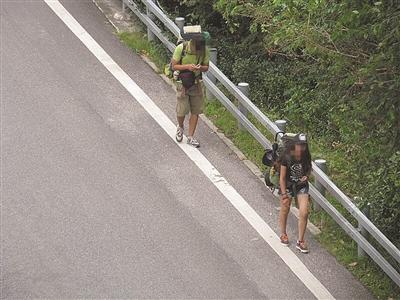 大图:一男一女沿着高速公路连接线行走,边走边玩手机。车辆呼啸而过,十分危险。小图:背包客终于打到顺风车。徐福庚摄