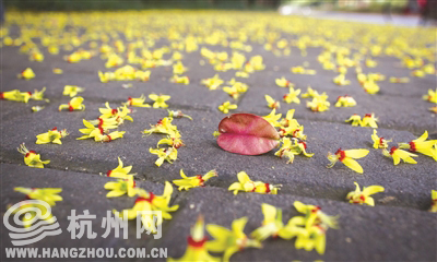 天目山路上的黄山栾进入了盛花期,黄色的花儿落满地。记者朱丹阳