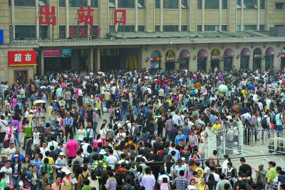 10月7日下午,国庆长假最后一天,各火车站迎来返程高峰,北京站出站口人流涌动。记者和冠欣摄