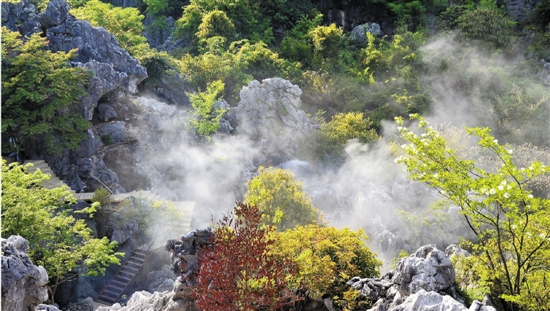 傅群华介绍,景区由三衢山、大古山和小古山组成,大古山的主要地貌景观是天坑、紫藤峡谷、石林迷宫等,小古山景区则以奇、险、美为主要特色。登顶后不想再走的客人可以体验高空索道和花岗岩滑道直接下山。