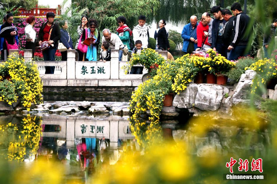 10月22日,以“花开盛世·菊韵泉城”为主题的济南市第三十六届趵突泉金秋菊展在泉城济南拉开帷幕。本届菊展布景时因地制宜、依景造势。对园区内假山石、溪岸运用悬崖菊打造菊花溪、菊花山景观,使之相互交融、协调一致。梁犇摄