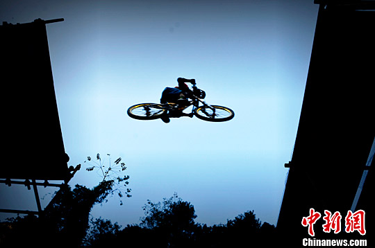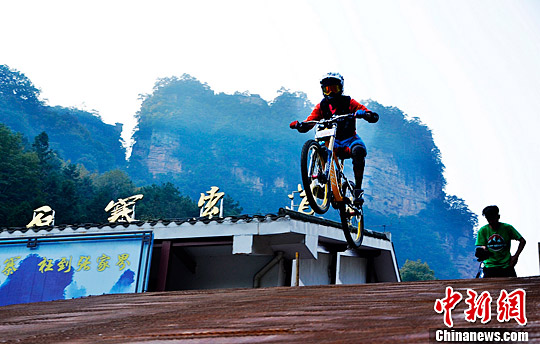 10月22日,自行车速降爱好者在张家界武陵源黄石寨体验极限速降。当日,峰林极限速降赛道在世界自然遗产地张家界武陵源黄石寨景区建成。这是张家界发展户外休闲旅游取得的又一项重要成果。据悉,2015张家界极限自行车挑战赛将于11月6日在此举行。