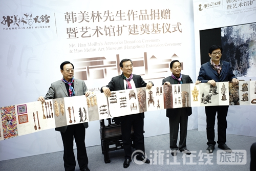 捐赠仪式结束后,杭州韩美林艺术馆随即举行了奠基仪式。据了解,杭州韩美林艺术馆将在现有展馆东南侧进行扩建,新建展馆占地459平方米,分上下三层,扩建面积1500平方米。将通过连廊形式与现有展馆连成一体,同时对周边环境也将进行提升。艺术馆扩建完成后,将进一步完善艺术馆的硬件设施,丰富馆藏,打造更加精美的艺术殿堂。