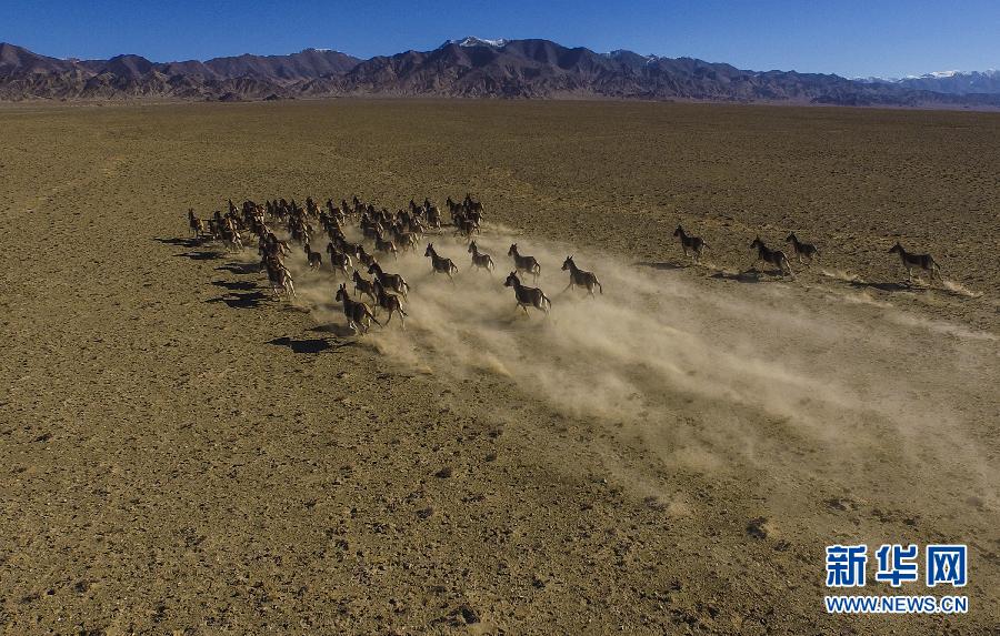 10月17日,几匹野驴在阿尔金山国家级自然保护区内奔跑。金秋十月,高原天气逐渐转凉,与罗布泊、可可西里和羌塘齐名的中国四大无人区之一——阿尔金山国家级自然保护区进入了一年中较为适合进入的季节。新华社发(黄永忠摄)