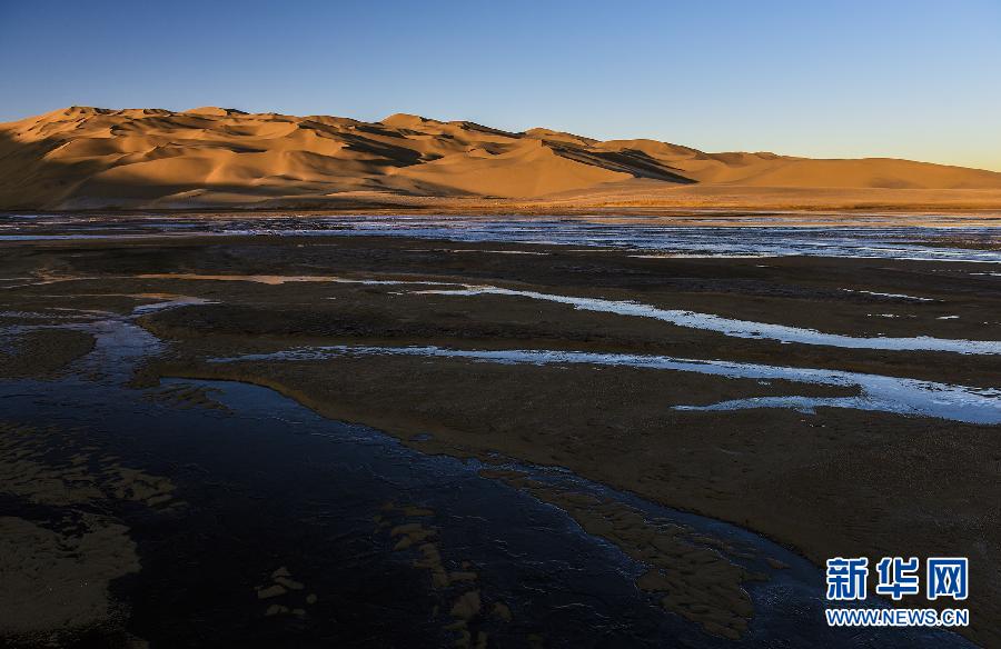 阿尔金山国家级自然保护区的沙山与河流(10月17日摄)。金秋十月,高原天气逐渐转凉,与罗布泊、可可西里和羌塘齐名的中国四大无人区之一——阿尔金山国家级自然保护区进入了一年中较为适合进入的季节。新华社发(李杨)摄
