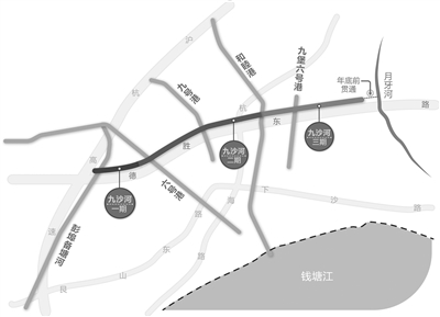 九沙河是一条全靠人工挖出来的河道。它与德胜快速路平行,就在德胜快速路北面。按规划,全长5.88公里的九沙河是德胜东路及沿线地块雨水排放的主要出口,西面连着彭埠备塘河,东侧将与运河二通道相连,规划的主要泄洪流向是自西向东,通过八堡泵站排入运河二通道进钱塘江,近期则是通过和睦港排入钱塘江。