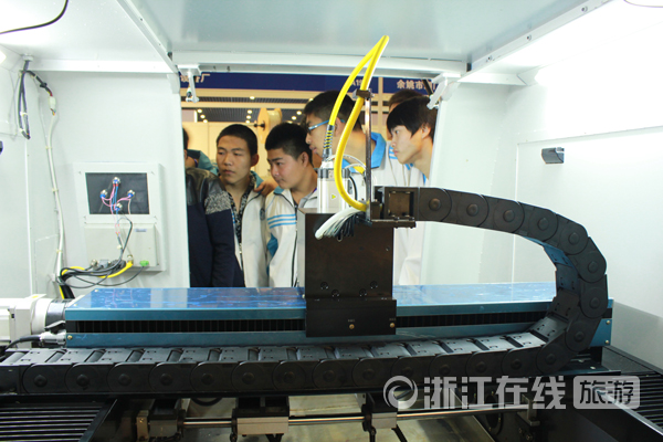 专业、精密的零件和仪器让人眼花缭乱,而更吸引游客眼球的则是现场展出的智能化设备。激光打印机无疑是本次展会的“明星产品”,只要在电脑上设定好要打的字和字体就能自动打印,不少游客都掏出手机,为自己“独家定制”了一款个性花纹;激光精密切割设备则吸引了一大批学生的围观。展位负责人告诉大家,别看这是一个“大家伙”,他的灵活性可强了,能把钢板切割出十二生肖的模样呢!而来自浙江大学的“小黄人”则代表着高科技和智能化,现代化工业生产离不开他。