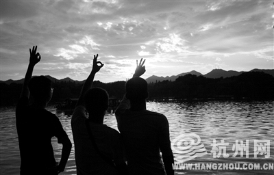 昨天天气晴朗,几个年轻人在夕阳下合影。 见习记者 严嘉俊 摄