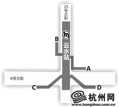 云水站开通A、B、C、D共4个出口;其中B和C两个出口分别与六号大街二十五号路口、二十五号路六号大街口这两个公交站点接驳。