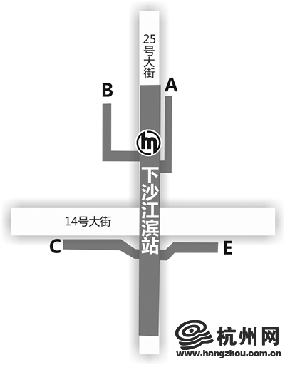 下沙江滨站开通A、B、C、E出口。接驳二十五号路听涛路口、听涛路二十五号路口、下沙江滨公交站、二十五号路十四号大街口等公交站。