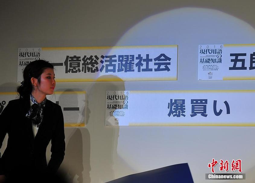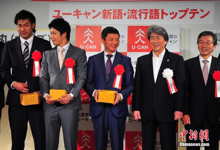 被日本坊间用以形容中国游客在日购物出手豪爽现象的“爆买”一词,在12月1日晚间揭晓的本年度“日本新语-流行语大奖”评选中,不出所料地斩获大奖。图为日本最大免税连锁店“乐购仕”的罗怡文社长(右3)当天获邀登台领受此奖。(中新社记者王健摄)