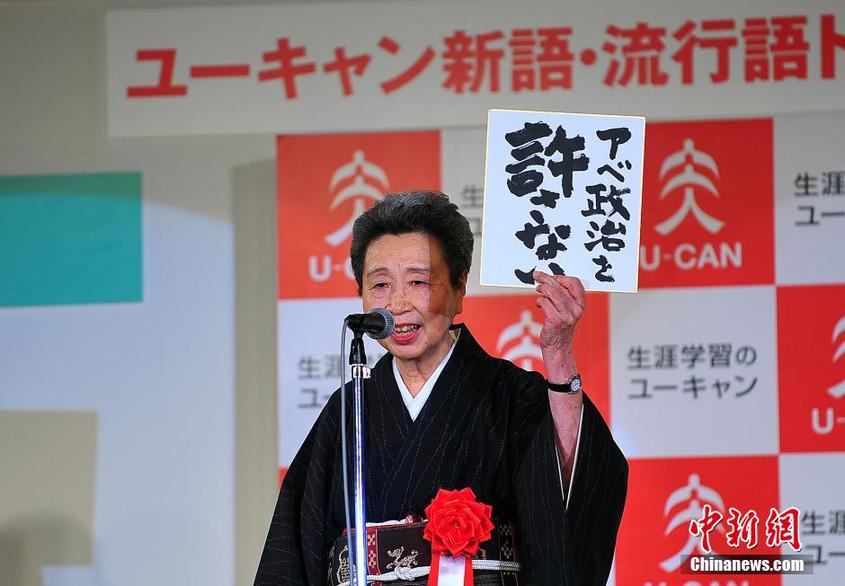 2015年度“日本新语-流行语大奖”评选结果12月1日揭晓。在进入前十位的获奖流行语中,日本市民团体在反安保活动中统一制作的标语“安倍政治不能容忍”赫然在列。图为创意这一用语的日本作家泽地久枝登台领奖,再度亮出该标语牌。(中新社记者王健摄)
