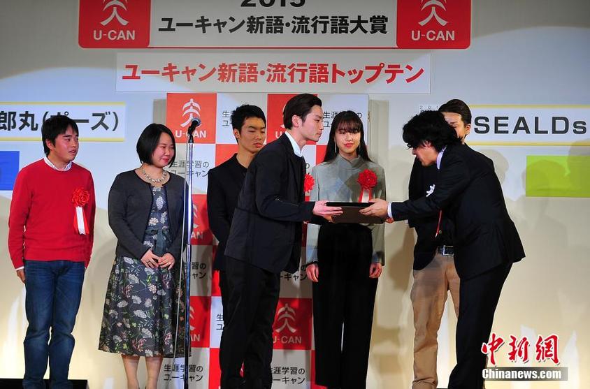 2015年度“日本新语-流行语大奖”评选结果12月1日揭晓。在进入前十位的流行语中,出现了今年日本民众反安保活动中颇具影响力的青年反战团体名号“SEALDs”。图为该团体成员登台领奖。(中新社记者王健摄)