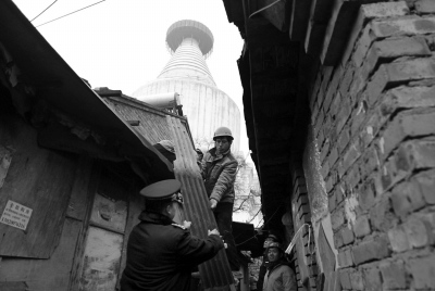 城管拆除白塔寺周边违建。记者欧阳晓菲摄
