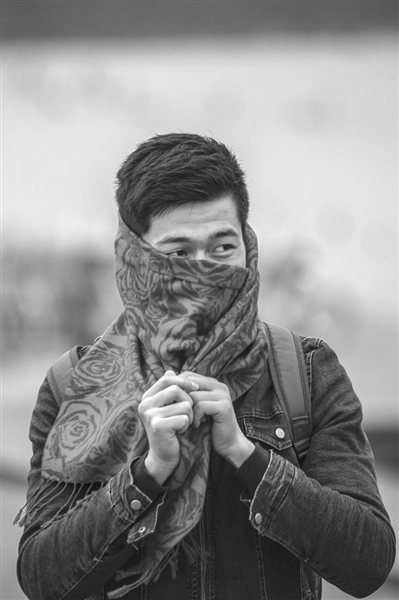 白堤上的游客用围巾捂住了脸