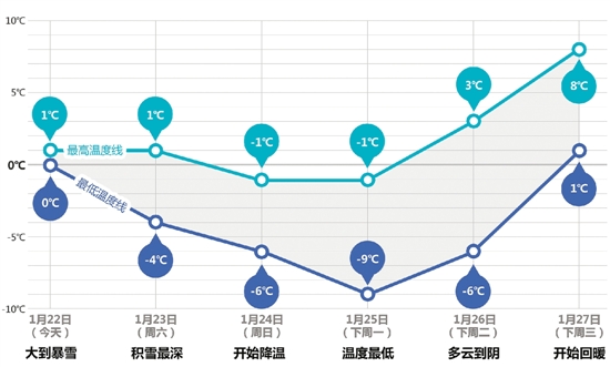 到了周六,强冷空气的主体才真正到达。周六积雪最深,大部分地区可达8~15厘米,山区可达20厘米以上。气温将大幅下降并伴有风力增大过程,一直持续到26日。过程降温幅度可达8~10℃,局部10℃以上。可能出现严重的冰冻、冻雪和道路结冰。