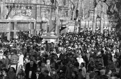 2月8日,游客在北京龙潭公园庙会游览。