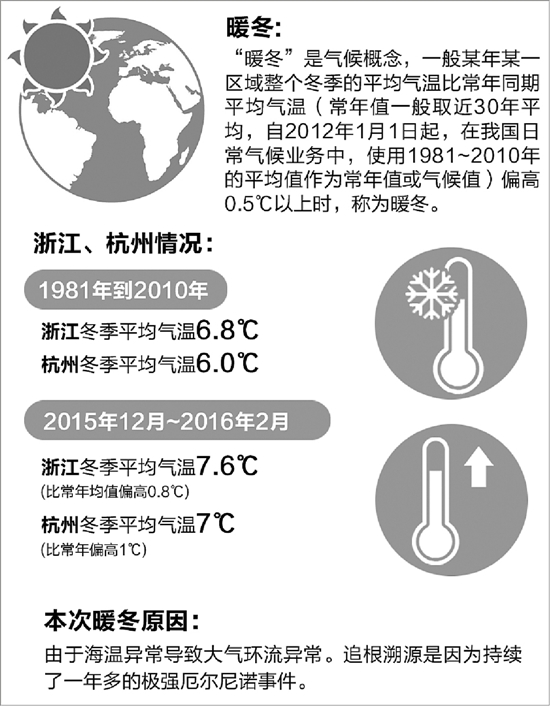 虽然杭城尚未入春,但随着2月的落幕,关于杭州这个冬季(2015年12月~2016年2月)是暖是冷有了定论:今冬杭州平均气温7℃,比常年冬季平均气温偏高1℃,是为暖冬。