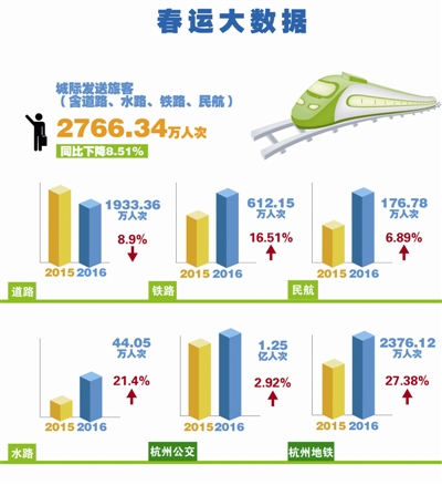 从1月24日至3月3日,40天的春运终于圆满落下帷幕。市春运办日前公布了2016年春运的整体情况。今年春运客运量在前几年连续增长的情况下有所回落(见图表)。这跟近两年我市加强春运供需调节,有针对性地引导和组织旅客错峰出行有一定的关系。主要有三方面原因:一是今年大专院校放假早于春运,学生流提前启动;二是经济发展进入新常态,外出打工人员有所减少;三是日益完善的高铁、动车网络,以及私家车的大幅增多,加上高速公路通行免费政策,对道路客流有一定影响。