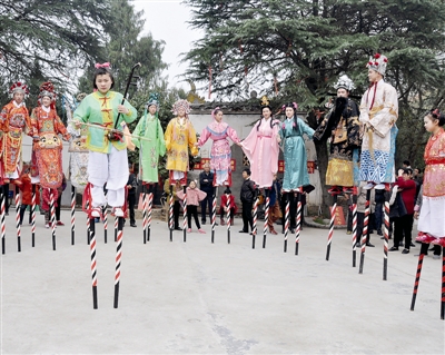 在金庭镇石鼓寺举行的高跷技艺展示,吸引了500多名游客驻足。