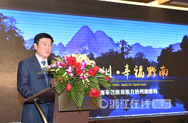 黔南州副州长刘建民作黔南主题旅游推广。摄影傅泊霖