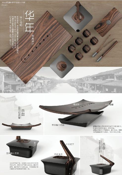 设计理念:年华逝去,岁月将西塘的景色变成点与线的结合,我们用这些点与线加以创作并融入茶具中,黑色陶土与木材的组合,描画出西塘经历时间磨砺后的古色古香。