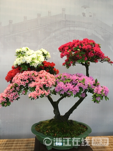 “太漂亮了!居然同时有5种颜色的花朵嫁接在一颗盆景上,手艺真是了不得了!”一盆五种颜色花朵造型别致的杜鹃盆景引来阵阵赞叹。