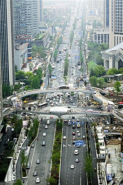 4月25日,从高处鸟瞰经过近9个月整治施工的新塘路,其庆春路以南至新业路段已先期完工并正常通车,往北至新风路段也已进入两侧人行道路面铺设、环境绿化等扫尾工作,包括位于新塘路庆春路口的杭城首座仿生态树形人行天桥在内,均将在本月底全线竣工,成为城东区块一条连接钱江新城、城东新城及火车东站之间的南北向景观主干道。