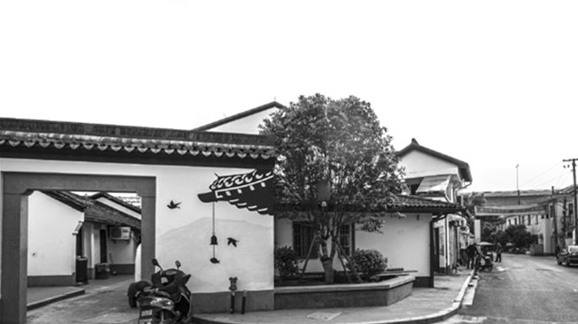 往里走,凤凰山脚路边的一面白色围墙上两个影壁映入眼帘,深灰色的麒麟祥云圆形图案一下子将人们带到过去的时光里。