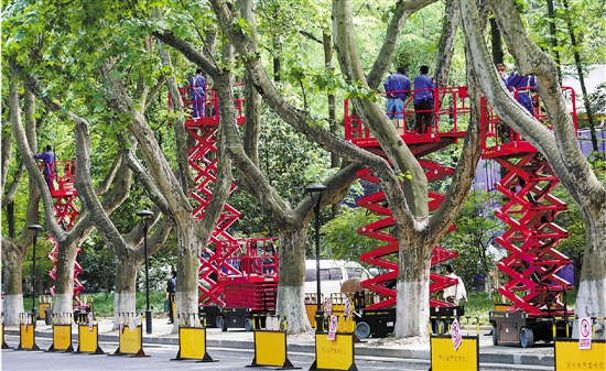 5月17日,杭州南山路,工人们把白色的LED灯串缠绕在梧桐树干上,灯串点亮后会呈现闪闪的视觉效果,与两侧路灯灯光互补,交织成多彩的城市景观长廊。