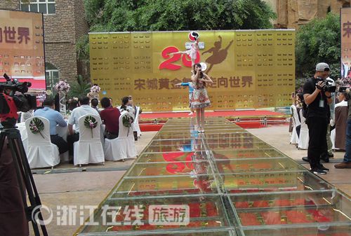浙江在线5月19日讯(通讯员方燕)5月18日,宋城举行20周年庆典活动。666块1公斤重的黄金铺就的金光灿烂的舞台,由它来表示“千古情”系列演出是世界上含金量最高的演出。据介绍,仅《宋城千古情》一台演出,票房总收入达上百亿元,是现场所有黄金价值的几十倍,创造了世界演艺史上空前的奇迹。宋城演艺已经成为了全球知名的演艺集团,无论是剧院数、座位数、演出场次、年观演人数、演出利润都成为了世界演艺第一。
