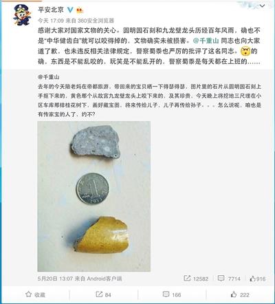 昨日北京市公安局也通过微博“平安北京”发声说,圆明园石刻和九龙壁龙头历经百年风雨,确实不是“中华健齿白”就可以咬得掉的。