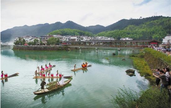 正当大家沉浸在美食中,溪对岸的廊桥上响起了歌声,溪上多了很多支竹筏,竹筏上粉红女郎款款舞之。随之而来的,又是极具乡土气息的《对歌“九道菜”》,在溪的两岸对唱着。