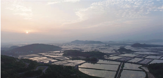 漫步在依山而建的游步道,山脚下星罗棋布的海水养殖塘,一览无余,时而可见养殖户正辛勤劳作。每当日出,阳光透过云层洒在养殖塘上,波光粼粼,仿佛给水面镀上一层金色的薄纱。2014年国庆,中央电视台特地来此记录下了“日出东方”的绚丽时刻。