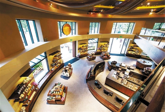 穿过户外休息区,推开气派的剧院式大门,咖啡师们正欢乐地唱着星巴克首个门店店歌。这家店总共分两层,总面积有400多平方米。一层是点单区,有2个半圆形的咖啡吧台;二层有45个座位,从这个“咖啡剧院”的二层可以俯瞰一层大堂,欣赏咖啡师的精彩表演,6台专业的咖啡机是最拿手的乐器。