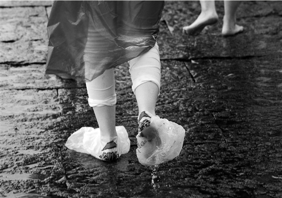 昨天杭州暴雨,西湖边白堤上,一位游客为了防止鞋湿,赤脚套上了塑料袋行走。连国庆摄