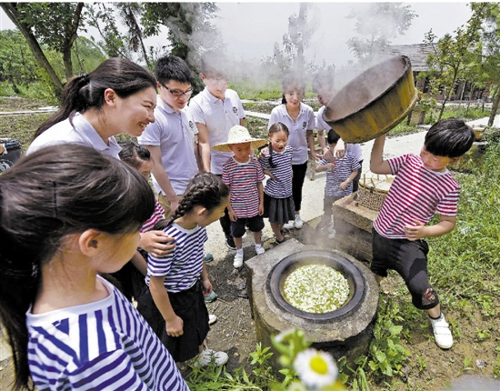 在磨坊的餐厅里,几位游客正在享用早上刚刚新鲜采摘的西葫芦;旁边的乌村茶室里,女人们正在跟着工作人员学编草鞋;稍远处的虾塘里,男人们带着孩子钓起了一只只张牙舞爪的龙虾。组团,是中国乡村特有的一种形式,在乌村,有磨坊、知青年代、渔家、竹屋等7个组团,全是按照乌镇当地人的传统风俗命名。