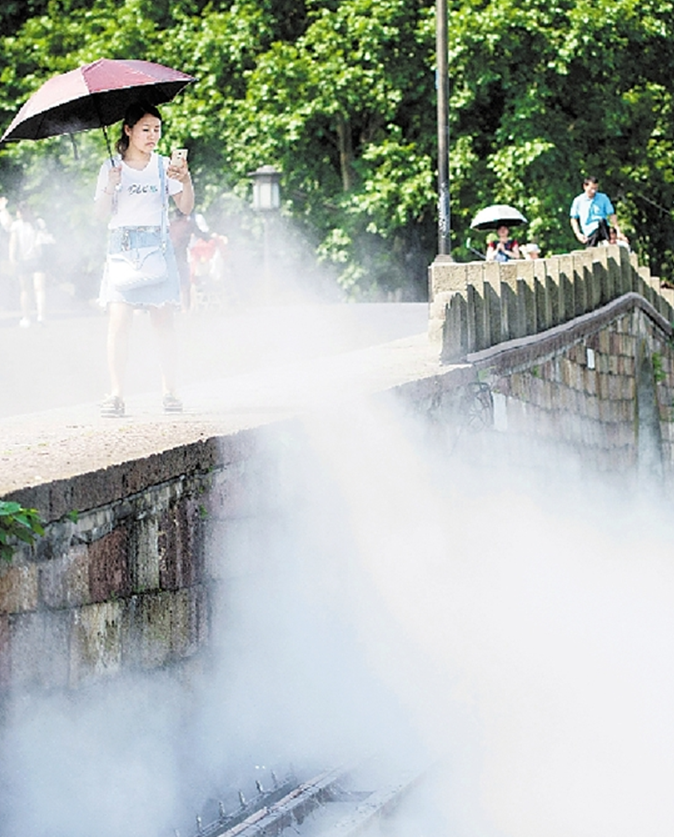 今夏第一个高温日诞生 断桥启动喷雾装置为游客降温
