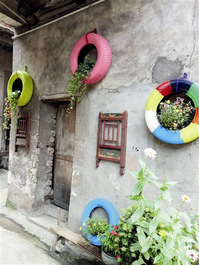 说干就干,妇女姐妹边收集旧物,边创意加工,又自己搭配种植了一些花草,放在猪栏屋、台门、豆腐坊等一些“老”地方,顿时意趣横生。一些村民也开始自己动手,有的把煤饼炉、盐钵头做成了花盆,有的把废旧轮胎组合成各种艺术造型,有的从溪边捡来鹅卵石砌成花坛……